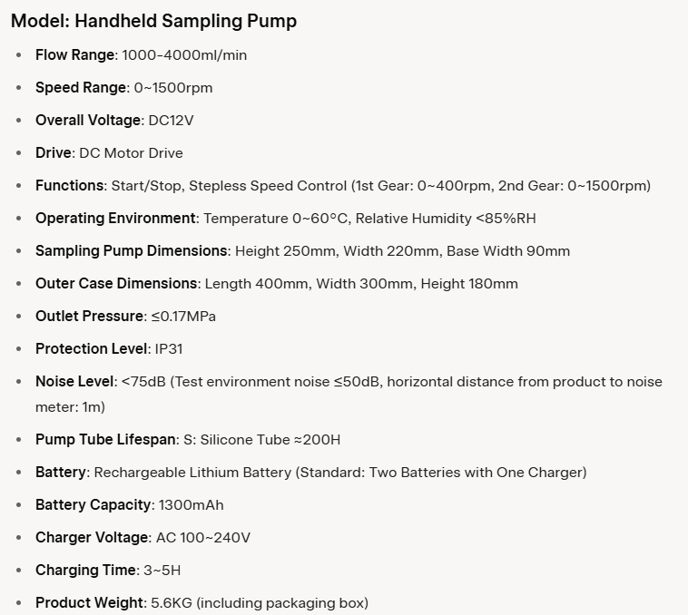 The Handheld Sampling Pump delivers precise, wireless sampling for lab, outdoor, and industrial use, with durable ABS construction and efficient 1000-4000ml/min flow.